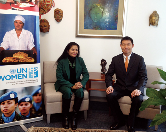 此外,,纽约时间3月5日上午,,,联合国总部官员还在会前特邀方玉友先生,,,,共同探讨企业如何以创新思维帮助女性迎接职场挑战。。。妇女署执行副主任Lakshmi Puri女士热情地为方玉友先生介绍了诸多解决女性就业挑战的国际潮流思路。。。。